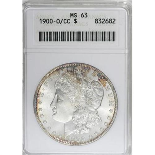 <B>1900-O/CC $1 MS63 ANACS.</B></I> VAM-12. A Top 100 Variety. VAM-12 shows more of the Carson City mintmark than any of the other O/CC varieties, and it is also scarcer than VAM-8 or VAM-11. This lustrous and boldly struck representative has peripheral golden-brown, apple-green, and rose-red patina. The fields are clean, and the cheek has faint marks.<BR><BR><B>Coin Engraver:</B> George T. Morgan<BR><BR><b>Shipping:</b> Coins & Currency (<a target="_blank" href="http://www.heritageauctions.com/common/shipping.php">view shipping information</a>)