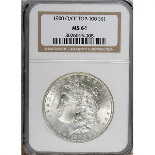 <B>1900-O/CC $1 MS64 NGC.</B></I> VAM-10A. A Top 100 Variety. The N in IN is die clashed near Liberty's neck, characteristic of this seldom-encountered VAM. VAM-8 and VAM-11 are the two most common O/CC VAMs. A lustrous and nearly untoned near-Gem with smooth surfaces and minor incompleteness of strike in the centers.<BR><BR><b>Shipping:</b> Coins & Currency (<a target="_blank" href="http://www.heritageauctions.com/common/shipping.php">view shipping information</a>)