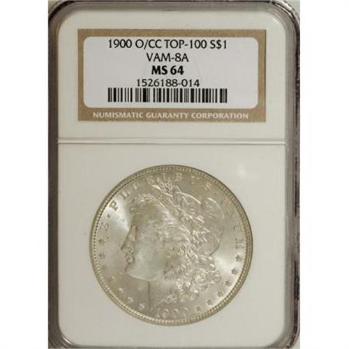 <B>1900-O/CC $1 MS64 NGC.</B></I> VAM-8B. A Top 100 Variety. Designated as VAM-8A on the NGC insert. VAM-8A is a late state of VAM-8 with die rust near the mintmark. VAM-8B has bold clash marks along Liberty's profile. A lustrous and creamy near-Gem with minor central incompleteness of strike.<BR><BR><B>Coin Engraver:</B> George T. Morgan<BR><BR><b>Shipping:</b> Coins & Currency (<a target="_blank" href="http://www.heritageauctions.com/common/shipping.php">view shipping information</a>)