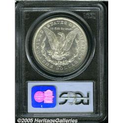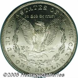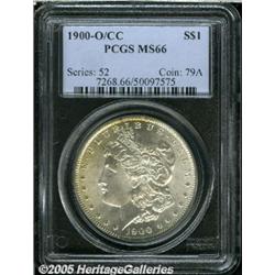 <B>1900-O/CC<img border='0' src='http://www.heritagecoins.com/images/star.gif' width=10 height=10>$1 MS66 PCGS.</B></I> This is a satiny Gem with brilliant silver surfaces. The obverse has a narrow crescent of gold toning along the left side, and the reverse is fully brilliant. The fields on the reverse are almost prooflike in nature. The former CC mintmark beneath the O is clearly visible, although it is slightly obscured due to die rust. Only a couple of finer examples have been certified by PCGS. Population: 64 in 66, 2 finer (2/05).