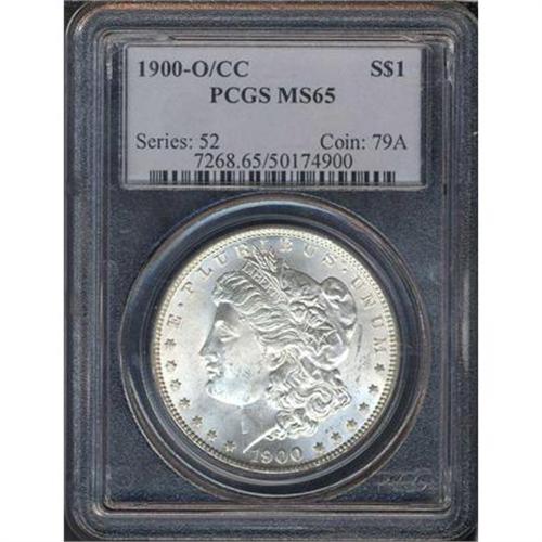 <b>1900-O/CC Morgan Dollar. PCGS graded MS65.</b> Sleek white in color, the silvery effect seesaws with an occasional hint of a bagmark but nothing out of the ordinary. All minute detail fully evident on this bold overmintmark variety <b>(PCGS # 7268)</b> <i>