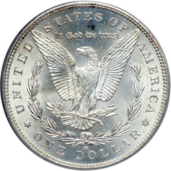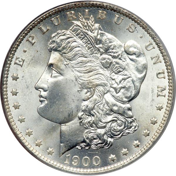 1900-O/CC Morgan Dollar. PCGS graded MS-65. Housed in an Old Green Holder. Well struck and white. Once the Carson City mint closed its doors forever in 1893, it must have had several spare reverse dies on hand which were returned to the home mint at Philadelphia. There, the dies were overpunched with an "O" mintmark and sent on to New Orleans. Much of the underfigure "CC" remains. Pop 698; 81 finer, 3 in 65+, 76 in 66, 2 in 67 (PCGS # 7268) .
