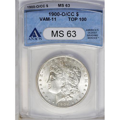 <B>1900-O/CC<img border='0' src='http://www.heritagecoins.com/images/star.gif' width=10 height=10>$1> MS63 ANACS.</B></I> VAM-11. A Top 100 Variety. Booming luster bathes this well struck and nearly untoned overmintmarked silver dollar. The fields are beautifully preserved, and light facial marks are undistracting.