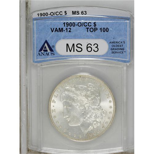 <B>1900-O/CC S$1 MS63 ANACS.</B></I> VAM-12. A Top 100 Variety. This variety features the most prominent remnants of the underlying Carson City mintmark. Lustrous surfaces display a few wisps of light tan color at the margins, and reveal well struck devices. A few minute marks limit the grade.<BR><BR><b>Shipping:</b> Coins & Currency (<a target="_blank" href="http://www.heritageauctions.com/common/shipping.php">view shipping information</a>)