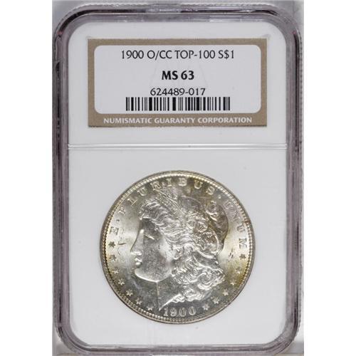 <B>1900-O/CC<img border='0' src='http://www.heritagecoins.com/images/star.gif' width=10 height=10>$1> MS63 NGC.</B></I> VAM-11. A Top 100 Variety. The pressing need for reverse dies brought back the Carson City mintmark as a palimpsest on this issue, among others. Select and highly lustrous with patches of lemon-yellow toning on the obverse, though the devices are significantly abraded.