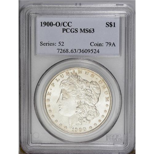 <B>1900-O/CC<img border='0' src='http://www.heritagecoins.com/images/star.gif' width=10 height=10>$1> MS63 PCGS.</B></I> VAM-11. A Top 100 Variety. The reverse is from an old Carson City die that found new life at the New Orleans Mint. For all practical purposes, this coin should grade at least MS64, except for a short scrape on Liberty's cheek. All other aspects of strike, luster, and eye appeal suggest a coin approaching the Gem grade level.<BR><I>From The David L. Goodwin Collection.</B></I> <BR><BR><B>Important notice:</B> Heritage usually auctions material at the rate of 200-250 lots per hour. On some occasions eBay Live bid software or the Internet may not be able to keep up with the pace of the auction. We recommend placing a realistic absentee bid now as insurance to avoid disappointment. Occasionally the auctioneer may eliminate or reject an eBay Live bid, and the auctioneer may also reopen a lot after the close of the eBay live bidding (usually because we missed an audience bid), and may reject your bid even if it shows you as the winning bidder. By bidding via eBay Live, you agree that Heritage may award the lot to another bidder at its sole discretion under the circumstances described above or any other reasonable circumstances. Since eBay bids are not shown to us until we open the lot on the floor, we treat those bids just like floor bids. In most cases the floor responds before the eBay bid is presented to us, due to Internet lag time, so for consistency we have made it a policy that floor bids are always considered first over tie eBay live bids. Also please note that all Heritage lots purchased through eBay Live carry a 20% Buyer's Premium. Please make sure you read the Terms and Conditions before you bid. This lot is being auctioned in conjunction with a live floor auction by Heritage Galleries & Auctioneers. All final auction and invoice information will be supplied by Heritage Galleries & Auctioneers, and all other information should be considered preliminary. Lot:3746 <BR><BR><B>Winning Notification and Billing:</B> After the FINAL session in this auction is complete, Heritage will send e-mail and snail mail invoices. This process normally takes several days. All final auction and invoice information will be supplied by Heritage Galleries & Auctioneers, and all other information should be considered preliminary. <BR><BR>This auction will be conducted on a live auction floor and over the Internet through eBay Live. If you choose to place an absentee bid, please take a moment to <font color='#0000ff'><u><a href='http://pages.ebay.com/liveauctions/help/before/laabsentee.html'>learn how eBay Live absentee bidding works</a></u></font><font color='#000000'>