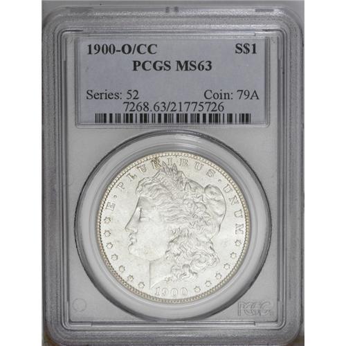 <B>1900-O/CC<img border='0' src='http://www.heritagecoins.com/images/star.gif' width=10 height=10>$1 MS63 PCGS.</B></I> VAM-10A. A Top 100 Variety. A die clash from the wing in front of Liberty's neck and the arrangement of fine die lines within LIBERTY, confirm the scarce VAM-10A. A lightly toned and lustrous piece, not fully struck above the ear but generally crisp throughout.