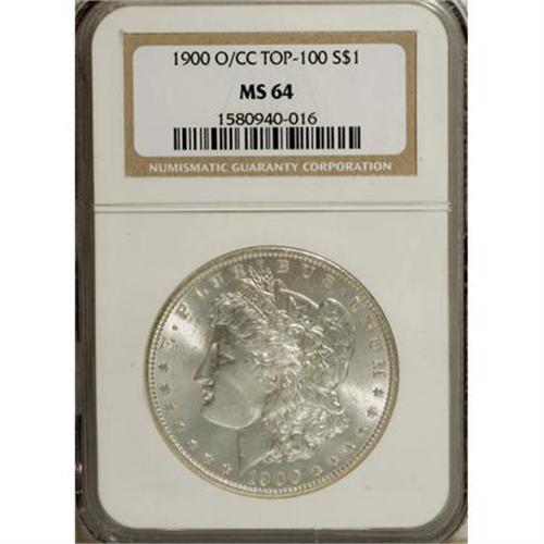 <B>1900-O/CC $1 MS64 NGC.</B></I> VAM-12. A Top 100 Variety. There are six different die pairs for the 1900-O/CC, but VAM-12 shows more of the CC than the others. This well struck near-Gem has effusive luster and only a hint of golden toning. The reverse is well preserved, and the obverse is also smooth.<BR><I>From The Laguna Niguel Collection, Part Two.</B></I><BR><BR><B>Coin Engraver:</B> George T. Morgan<BR><BR><b>Shipping:</b> Coins & Currency (<a target="_blank" href="http://www.heritageauctions.com/common/shipping.php">view shipping information</a>)