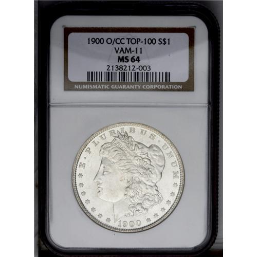 <B>1900-O/CC<img border='0' src='http://www.heritagecoins.com/images/star.gif' width=10 height=10>$1> MS64 NGC.</B></I> VAM-11. Wisps of honey toning visit this lustrous near-Gem, which features clean fields and only a faintly marked cheek. A decent strike for the variety. <BR><BR><B>Important notice:</B> Heritage usually auctions material at the rate of 200-250 lots per hour. On some occasions eBay Live bid software or the Internet may not be able to keep up with the pace of the auction. We recommend placing a realistic absentee bid now as insurance to avoid disappointment. Occasionally the auctioneer may eliminate or reject an eBay Live bid, and the auctioneer may also reopen a lot after the close of the eBay live bidding (usually because we missed an audience bid), and may reject your bid even if it shows you as the winning bidder. By bidding via eBay Live, you agree that Heritage may award the lot to another bidder at its sole discretion under the circumstances described above or any other reasonable circumstances. Since eBay bids are not shown to us until we open the lot on the floor, we treat those bids just like floor bids. In most cases the floor responds before the eBay bid is presented to us, due to Internet lag time, so for consistency we have made it a policy that floor bids are always considered first over tie eBay live bids. Also please note that all Heritage lots purchased through eBay Live carry a 20% Buyer's Premium. Please make sure you read the Terms and Conditions before you bid. This lot is being auctioned in conjunction with a live floor auction by Heritage Galleries & Auctioneers. All final auction and invoice information will be supplied by Heritage Galleries & Auctioneers, and all other information should be considered preliminary. Lot:3749 <BR><BR><B>Winning Notification and Billing:</B> After the FINAL session in this auction is complete, Heritage will send e-mail and snail mail invoices. This process normally takes several days. All final auction and invoice information will be supplied by Heritage Galleries & Auctioneers, and all other information should be considered preliminary. <BR><BR>This auction will be conducted on a live auction floor and over the Internet through eBay Live. If you choose to place an absentee bid, please take a moment to <font color='#0000ff'><u><a href='http://pages.ebay.com/liveauctions/help/before/laabsentee.html'>learn how eBay Live absentee bidding works</a></u></font><font color='#000000'>