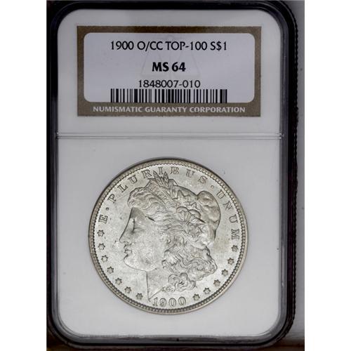 <B>1900-O/CC<img border='0' src='http://www.heritagecoins.com/images/star.gif' width=10 height=10>$1> MS64 NGC.</B></I> VAM-8A. A Top 100 Variety. A slightly later die state, with minor rust pits on the reverse near the mintmark. During the dismantling of the Carson City Mint, sometime after 1893, six reverse dies were found, sent to Philadelphia, and re-mintmarked for New Orleans use. Traces of the original CC remain under the O. This specimen is lustrous, and boldly struck, if typically soft over the central details. A luster graze on Liberty's cheek and a reeding mark in the left obverse field restrict the grade.