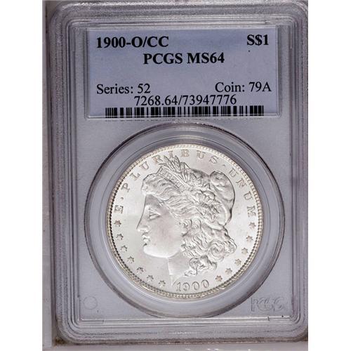 <B>1900-O/CC<img border='0' src='http://www.heritagecoins.com/images/star.gif' width=10 height=10>$1> MS64 PCGS.</B></I> VAM-11. A Top 100 Variety. Faint slide marks on Liberty's cheek are the grade limiting factor of this brilliant and highly lustrous example. Most all design details are boldly defined except of the hair over Liberty's ear. <BR><BR><B>Important notice:</B> Heritage usually auctions material at the rate of 200-250 lots per hour. On some occasions eBay Live bid software or the Internet may not be able to keep up with the pace of the auction. We recommend placing a realistic absentee bid now as insurance to avoid disappointment. Occasionally the auctioneer may eliminate or reject an eBay Live bid, and the auctioneer may also reopen a lot after the close of the eBay live bidding (usually because we missed an audience bid), and may reject your bid even if it shows you as the winning bidder. By bidding via eBay Live, you agree that Heritage may award the lot to another bidder at its sole discretion under the circumstances described above or any other reasonable circumstances. Since eBay bids are not shown to us until we open the lot on the floor, we treat those bids just like floor bids. In most cases the floor responds before the eBay bid is presented to us, due to Internet lag time, so for consistency we have made it a policy that floor bids are always considered first over tie eBay live bids. Also please note that all Heritage lots purchased through eBay Live carry a 20% Buyer's Premium. Please make sure you read the Terms and Conditions before you bid. This lot is being auctioned in conjunction with a live floor auction by Heritage Galleries & Auctioneers. All final auction and invoice information will be supplied by Heritage Galleries & Auctioneers, and all other information should be considered preliminary. Lot:3748 <BR><BR><B>Winning Notification and Billing:</B> After the FINAL session in this auction is complete, Heritage will send e-mail and snail mail invoices. This process normally takes several days. All final auction and invoice information will be supplied by Heritage Galleries & Auctioneers, and all other information should be considered preliminary. <BR><BR>This auction will be conducted on a live auction floor and over the Internet through eBay Live. If you choose to place an absentee bid, please take a moment to <font color='#0000ff'><u><a href='http://pages.ebay.com/liveauctions/help/before/laabsentee.html'>learn how eBay Live absentee bidding works</a></u></font><font color='#000000'>