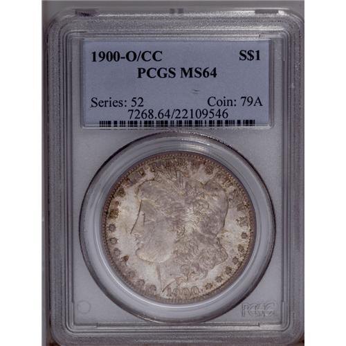 <B>1900-O/CC<img border='0' src='http://www.heritagecoins.com/images/star.gif' width=10 height=10>$1 MS64 PCGS.</B></I> VAM-11. A Top 100 Variety. An originally toned near-Gem with lovely salmon-pink coloration about the reverse periphery. Pearl-gray hues dominate the centers. Well struck, and only light contact on the cheek and chin prevents an even higher third party assessment.