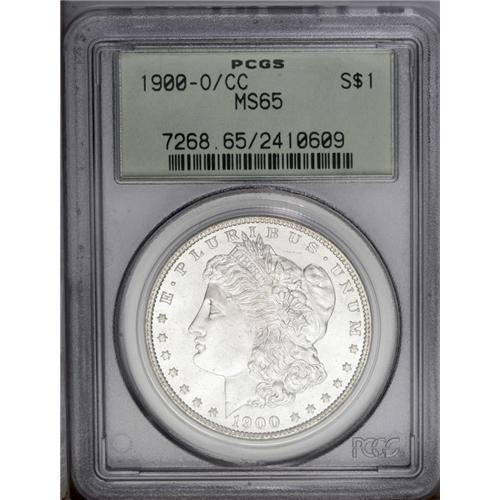 <B>1900-O/CC<img border='0' src='http://www.heritagecoins.com/images/star.gif' width=10 height=10>$1 MS65 PCGS.</B></I> VAM-8. A Top 100 Variety. Both letters of the mintmark are faint but visible with magnification. Always an interesting variety and one that is much more elusive in high grades than a regular 1900-O dollar. This is a very pleasing Gem example that has smooth, satiny surfaces and nearly unmarked features. Well defined throughout and brilliant.