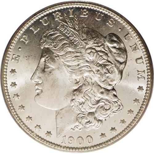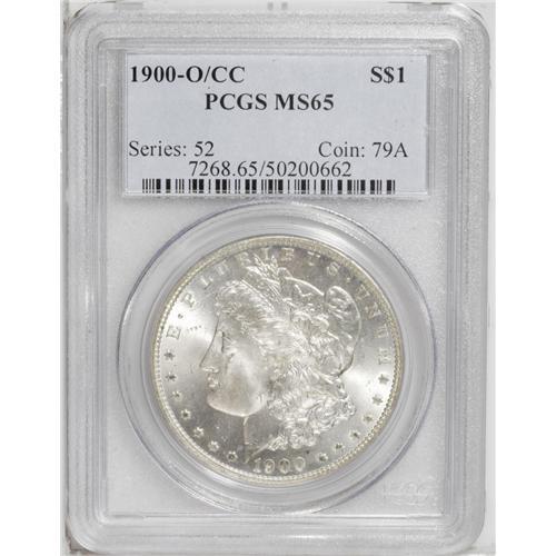<B>1900-O/CC<img border='0' src='http://www.heritagecoins.com/images/star.gif' width=10 height=10>$1> MS65 PCGS.</B></I> VAM-8. A Top 100 Variety. This is a frosty and highly lustrous Gem with exceptional eye appeal. The surfaces are pristine and free of marks aside from a few tiny hidden abrasions. The previous CC on the reverse die is clear and sharply visible beneath the final O. This is another important <I>Guide Book</B></I> variety that is in extreme demand due to its inclusion in that reference.