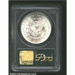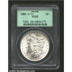 1900-O/CC S$1 MS66 PCGS. Brilliant and sharply struck with soft, satiny surfaces that are virtually unscathed by abrasions. The second C in the CC mintmark has an especially pronounced lower curve, being plainly visible to the unaided eye. A glass reveals virtually all of the second C, with the first C faint, as usual. Few examples of this popular overmintmark could match the quality of this piece. Population: 36 in 66, 2 finer (11/01). Important notice: We expect to be auctioning lots at the rate of 200-250 per hour. Sometimes eBay Premier live bid software cannot keep up with that pace, so we strongly recommend that you place a realistic proxy bid now as insurance to avoid disappointment. Also please note that all Heritage/CAA lots purchased through eBay Premier carry a 20% Buyer's Premium.