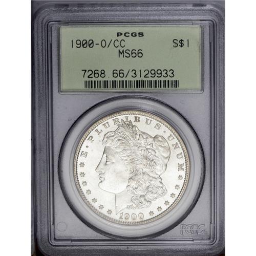 <B>1900-O/CC<img border='0' src='http://www.heritagecoins.com/images/star.gif' width=10 height=10>$1 MS66 PCGS.</B></I> VAM-8. Top 100 Variety. Fragments of the partially effaced Carson City mintmark bookend the prominent New Orleans mintmark. This nicely struck and completely brilliant premium Gem has booming cartwheel luster on each side. An exceptionally preserved representative of this popular variety. Population: 65 in 66, 2 finer (1/06).
