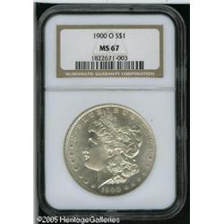 <B>1900-O<img border='0' src='http://www.heritagecoins.com/images/star.gif' width=10 height=10>$1 MS67 NGC.</B></I> Brilliant throughout with bright, sparkling mint luster. The surfaces are virtually unmarked and the striking details are intricately detailed. Population: 26 in 67, 0 finer (1/05). Lot:10568