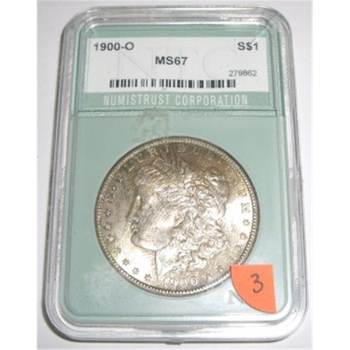 1900-O Morgan Silver Dollar *CERTIFIED by NTC MS-67*!! Serial # 279862. Case is Cracked a little bit. ***Coin & Currency Grades, Conditions and Values are not Northern Colorado Estate Liquidators Responsibilty. Grades, Condition and Values are determined by Consigner(s) & Buyers ONLY***
