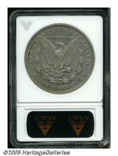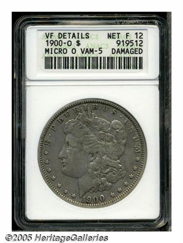<B>1900-O<S$1>--Damaged--ANACS. VF Details, Net Fine 12.</B></I> VAM-5, Micro O. Now regarded as a contemporary counterfeit, but the variety will undoubtedly retain its popularity. Well detailed and modestly marked, on the obverse. Damage exists over the tops of ITED, near the left reverse rim, and also just above A in AMERICA and below the first L in DOLLAR.