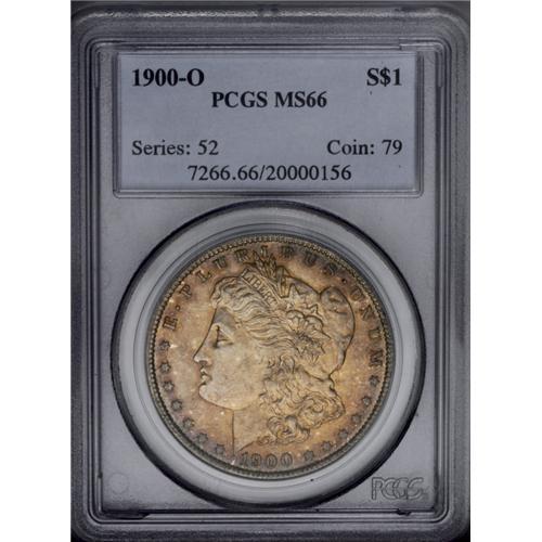<B>1900-O<img border='0' src='http://www.heritagecoins.com/images/star.gif' width=10 height=10>$1> MS66 PCGS.</B></I> Beautiful amber-golden toning adorns the bright, well struck, impeccably preserved surfaces of this lovely premium quality Gem. Fully detailed above Liberty's ear, and on the eagle's breast. <BR><BR><B>Important notice:</B> Heritage usually auctions material at the rate of 200-250 lots per hour. On some occasions eBay Live bid software or the Internet may not be able to keep up with the pace of the auction. We recommend placing a realistic absentee bid now as insurance to avoid disappointment. Occasionally the auctioneer may eliminate or reject an eBay Live bid, and the auctioneer may also reopen a lot after the close of the eBay live bidding (usually because we missed an audience bid), and may reject your bid even if it shows you as the winning bidder. By bidding via eBay Live, you agree that Heritage may award the lot to another bidder at its sole discretion under the circumstances described above or any other reasonable circumstances. Since eBay bids are not shown to us until we open the lot on the floor, we treat those bids just like floor bids. In most cases the floor responds before the eBay bid is presented to us, due to Internet lag time, so for consistency we have made it a policy that floor bids are always considered first over tie eBay live bids. Also please note that all Heritage lots purchased through eBay Live carry a 20% Buyer's Premium. Please make sure you read the Terms and Conditions before you bid. This lot is being auctioned in conjunction with a live floor auction by Heritage Galleries & Auctioneers. All final auction and invoice information will be supplied by Heritage Galleries & Auctioneers, and all other information should be considered preliminary. Lot:3743 <BR><BR><B>Winning Notification and Billing:</B> After the FINAL session in this auction is complete, Heritage will send e-mail and snail mail invoices. This process normally takes several days. All final auction and invoice information will be supplied by Heritage Galleries & Auctioneers, and all other information should be considered preliminary. <BR><BR>This auction will be conducted on a live auction floor and over the Internet through eBay Live. If you choose to place an absentee bid, please take a moment to <font color='#0000ff'><u><a href='http://pages.ebay.com/liveauctions/help/before/laabsentee.html'>learn how eBay Live absentee bidding works</a></u></font><font color='#000000'>