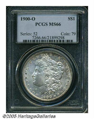 <B>1900-O<S$1> MS66 PCGS.</B></I> Frosty luster. The reverse is brilliant. The obverse exhibits pale champagne toning with wisps and blushes of golden-brown and violet at the rims.