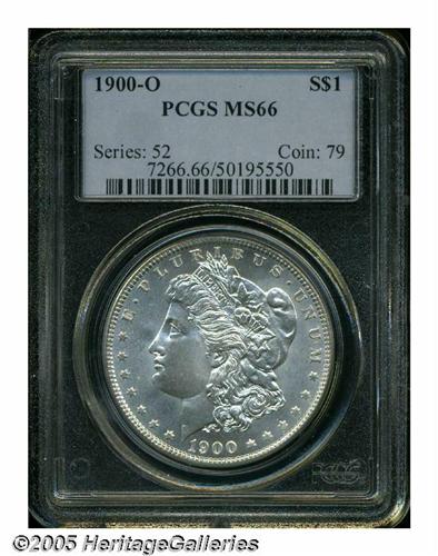 <B>1900-O<S$1> MS66 PCGS.</B></I> Well struck and untoned, with rolling cartwheel luster in the obverse fields, a flashy reverse, and just two or three insignificant nicks on obverse and reverse alike. A beautiful, no-questions premium Gem.