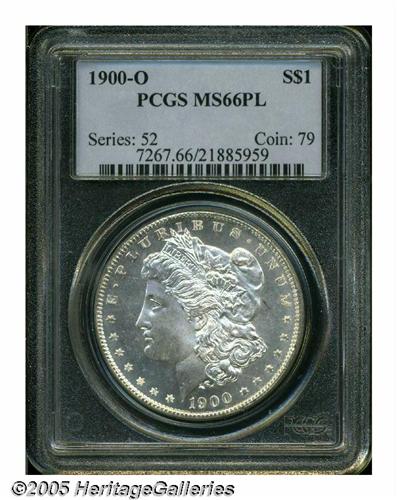 <B>1900-O<S$1> MS66 Prooflike PCGS.</B></I> Sharply struck on all of the design features, with bright, flashy surfaces that are virtually brilliant. The obverse is well preserved, while the reverse displays some minute marks on the eagle's breast and legs. PCGS and NGC combined have certified only 32 specimens, with none finer (5/05).