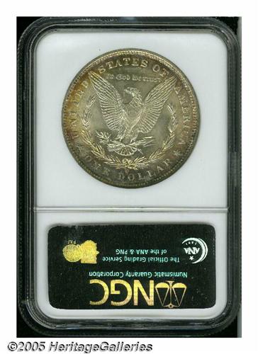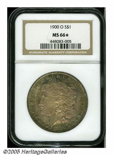 <B>1900-O<S$1> MS66 <S NGC.</B></I> The 1900-O Morgan is generally available in Mint State grades. The coins with Star designation are relatively scarce, however. As of March 2005, NGC certified only three pieces in MS66, with none finer. The lustrous surfaces of this specimen display medium intensity multicolored toning on the obverse, and peripheral golden-orange and lavender on the reverse. The design elements are sharply impressed, and the surfaces are immaculately well preserved.