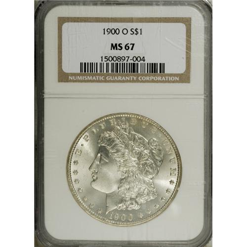 <B>1900-O S$1 MS67 NGC.</B></I> The 1900-O silver dollar is one of those issues that makes one--almost--think better of the New Orleans Mint. The present example offers brilliant, untoned surfaces that show exquisite quality, in the form of a deep, bold strike, superlative luster, a remarkable lack of abrasions of any size, and simply outstanding, over-the-top eye appeal.<BR><BR><b>Shipping:</b> Coins & Currency (<a target="_blank" href="http://www.heritageauctions.com/common/shipping.php">view shipping information</a>)