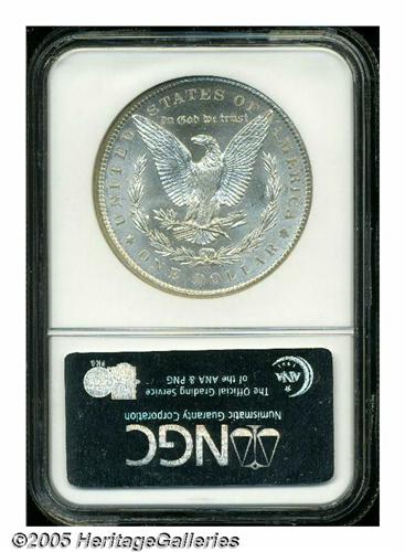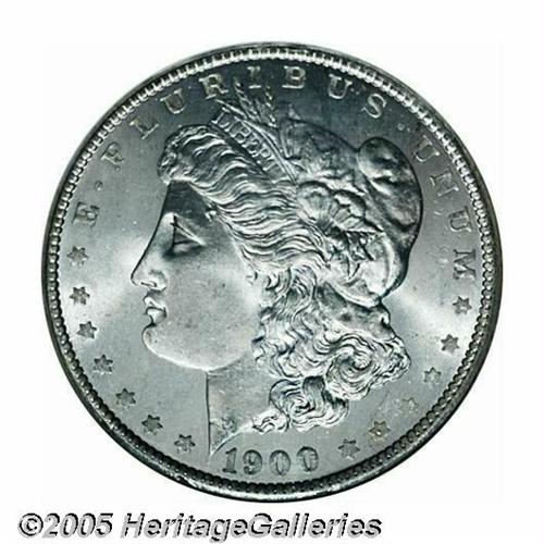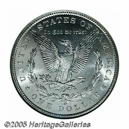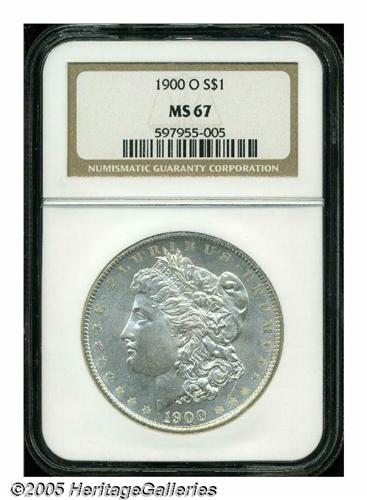 <B>1900-O<S$1> MS67 NGC.</B></I> The 1900-O was considered to be a common date in the 1950s, and that was before thousands more coins emerged from Treasury Department vaults in the 1962-1964 era. Perhaps not surprisingly, most Mint State survivors in today's hobby are noticeably abraded with surface preservation that does not warrant more than an MS62 designation. Many 1900-O Dollars were obviously "beat up" when they were shipped north from the New Orleans Mint for permanent storage. With fully lustrous surfaces that are smooth from rim to rim, the present survivor was particularly fortunate in that it survived with little, if any evidence of coin-to-coin contact. Scintillating mint frost swirls around sharply impressed, untoned features. Population: 29 in 67, 0 finer (4/05).