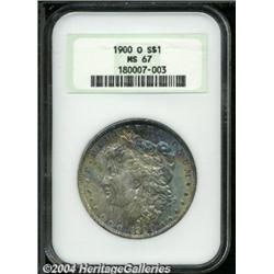 <B>1900-O<S$1> MS67 NGC.</B></I> Well struck with rich, deep rainbow toning over the obverse, and a bright, satiny, generally untoned reverse, where a few faint surface marks reside. The expertly preserved surfaces are virtually distraction-free, and only the slightest weakness is noted on the eagle's breast. A simply fabulous Superb Gem. <BR><BR><B>Important notice:</B> Heritage usually auctions material at the rate of 200-250 lots per hour. On some occasions eBay Live bid software or the Internet may not be able to keep up with the pace of the auction. We recommend placing a realistic absentee bid now as insurance to avoid disappointment. Occasionally the auctioneer may eliminate or reject an eBay Live bid, and the auctioneer may also reopen a lot after the close of the eBay live bidding (usually because we missed an audience bid), and may reject your bid even if it shows you as the winning bidder. By bidding via eBay Live, you agree that Heritage may award the lot to another bidder at its sole discretion under the circumstances described above or any other reasonable circumstances. Since eBay bids are not shown to us until we open the lot on the floor, we treat those bids just like floor bids. In most cases the floor responds before the eBay bid is presented to us, due to Internet lag time, so for consistency we have made it a policy that floor bids are always considered first over tie eBay live bids. Also please note that all Heritage lots purchased through eBay Live carry a 20% Buyer's Premium. Please make sure you read the Terms and Conditions before you bid. </span></font></tr></table></td></tr></table>