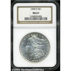 <B>1900-O<S$1> MS67 NGC.</B></I> This sharply struck and essentially brilliant Superb Gem has potent cartwheel luster and beautifully preserved surfaces. The reverse is especially close to fully pristine. An inordinately available issue in middle Mint State grades, but surprisingly difficult to obtain above Gem. Population: 21 in 67, 0 finer (7/04). <BR><BR><B>Important notice:</B> Heritage usually auctions material at the rate of 200-250 lots per hour. On some occasions eBay Live bid software or the Internet may not be able to keep up with the pace of the auction. We recommend placing a realistic absentee bid now as insurance to avoid disappointment. Occasionally the auctioneer may eliminate or reject an eBay Live bid, and the auctioneer may also reopen a lot after the close of the eBay live bidding (usually because we missed an audience bid), and may reject your bid even if it shows you as the winning bidder. By bidding via eBay Live, you agree that Heritage may award the lot to another bidder at its sole discretion under the circumstances described above or any other reasonable circumstances. Since eBay bids are not shown to us until we open the lot on the floor, we treat those bids just like floor bids. In most cases the floor responds before the eBay bid is presented to us, due to Internet lag time, so for consistency we have made it a policy that floor bids are always considered first over tie eBay live bids. Also please note that all Heritage lots purchased through eBay Live carry a 20% Buyer's Premium. Please make sure you read the Terms and Conditions before you bid. </span></font></tr></table></td></tr></table>
