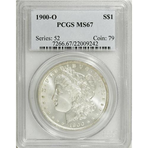 <B>1900-O S$1 MS67 PCGS.</B></I> This remarkable Morgan dollar is untoned and highly lustrous, with snow-white surfaces that display a noteworthy cartwheel sheen in the obverse and reverse fields. The design elements are crisply produced, and only the tiniest bit of weakness seems evident in the hair detail just above Liberty's ear. The surfaces are close to pristine, as only a couple of minute nicks on the obverse deny perfection. Population: 29 in 67, 0 finer (2/07).<BR><I>From The Jackson Hole Collection.</B></I><BR><BR><b>Shipping:</b> Coins & Currency (<a target="_blank" href="http://www.heritageauctions.com/common/shipping.php">view shipping information</a>)