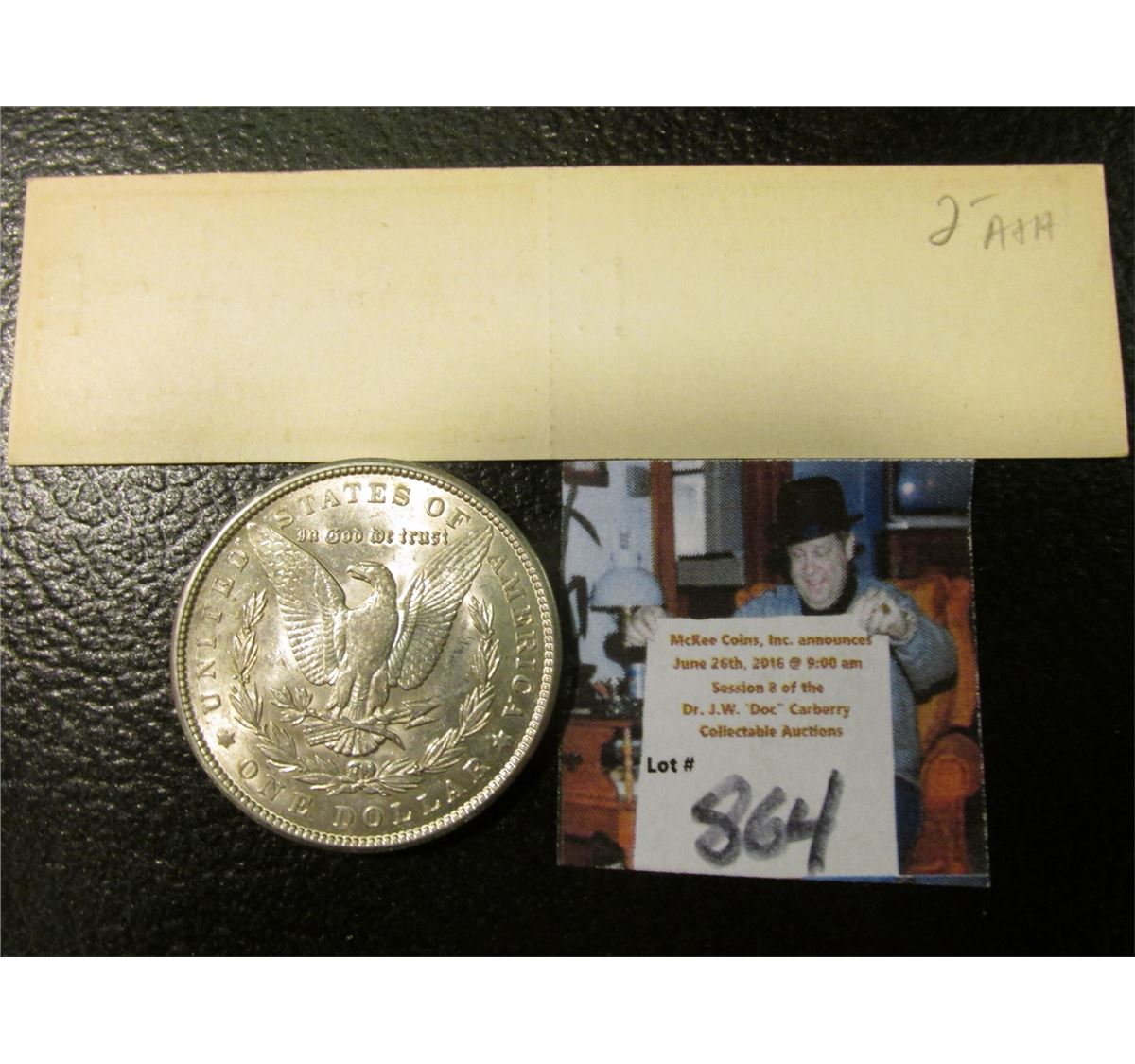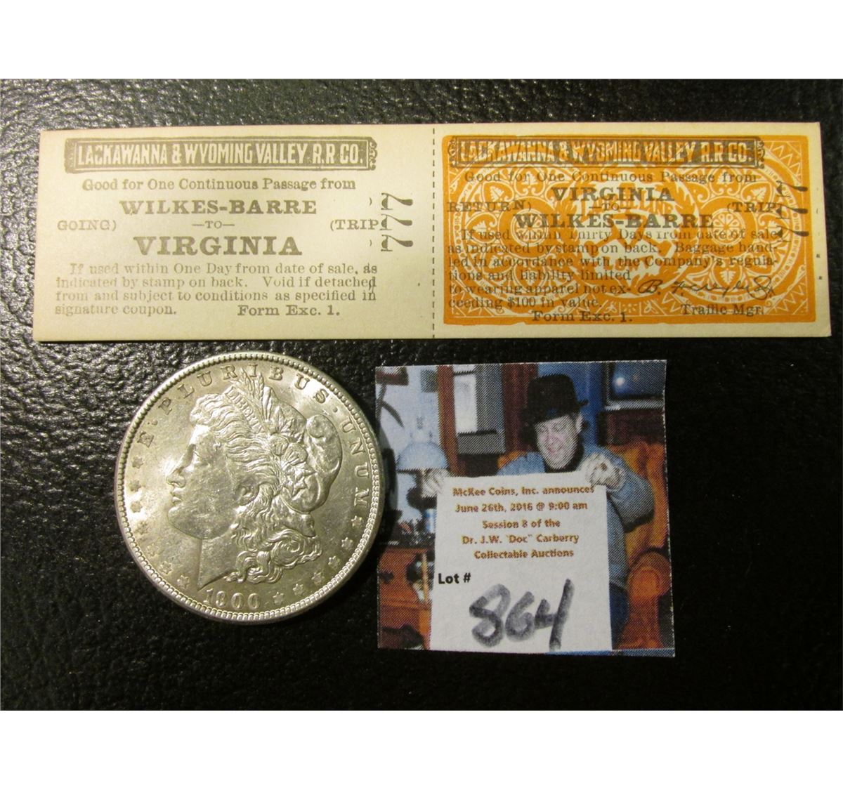 1900 P Morgan Silver Dollar, AU & a two part attached Passenger tickets for "Lackawanna & Wyoming Valley R.R. Co." unused.
