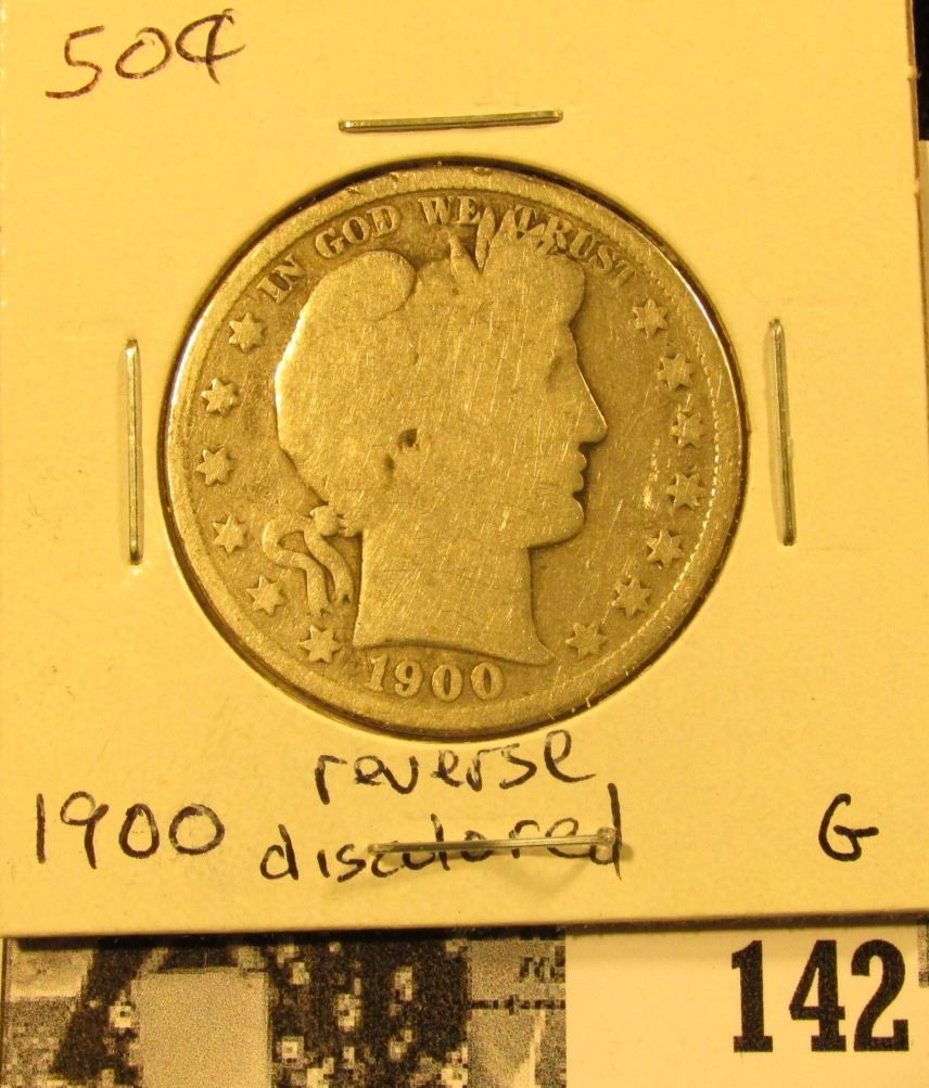 1900 P U.S. Silver Barber Half Dollar, Good. Some discoloration on the reverse.