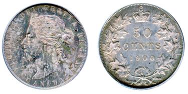 1900. PCGS graded AU-55. A strongly struck Victorian fifty cents with highly attractive medium heavy toning. Good ‘eye appeal’.