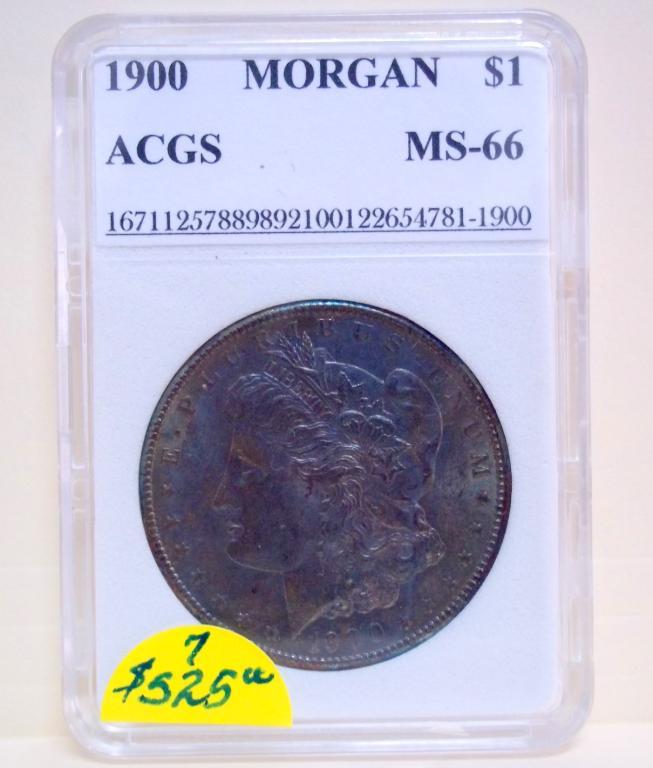 1900 Philadelphia Mint Morgan Dollar ACGS Certified Mint State-66. ! This coin is darkly toned on both obverse and reverse. A great addition to any high grade collection! This is a condition rarity coin with very few available is such a high grade.