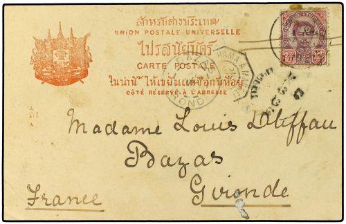 1900 Picture post card to FRANCE written from KRUNG KAO with CHULA SAKARAT datestamp bearing 4 on 12 a purple and carmine (SG 59) tied by PAK PHRIEO datestamp, sent by French paquebot with octagonal YOKOHAMA A MARSEILLE transit with BAZAS FRENCH arrival. Scarce postmark from Saraburi Province.