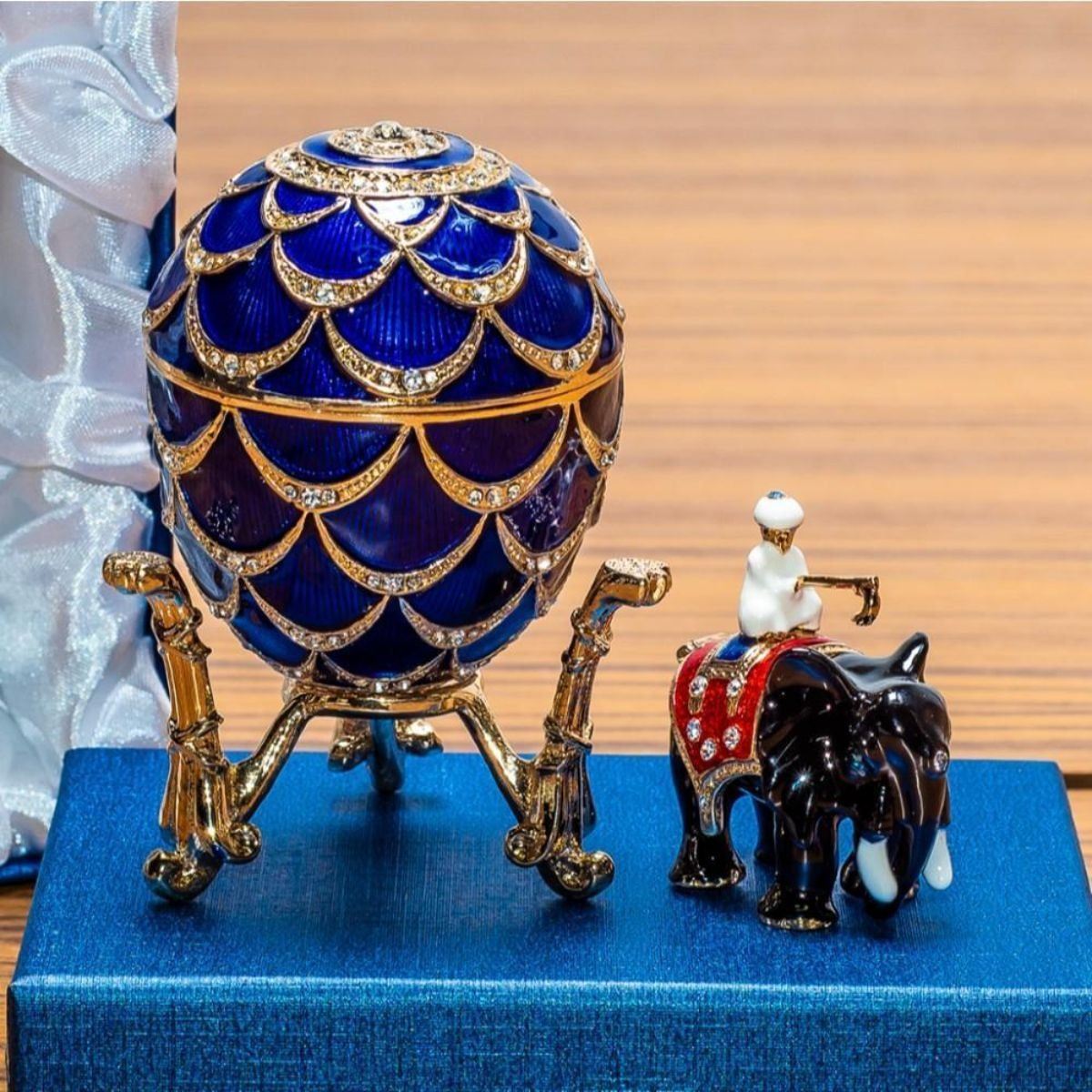 The Pine Cone egg is a jeweled enameled Easter egg made under the supervision of the Russian jeweler Peter Carl by workmaster Mikhail Perkhin in 1900. One end of the pine cone, a symbol of resurrection, is set with four diamonds, forming a quatrefoil enclosing the date “1900â€. The opposite end is set with a diamond star, enclosing a portrait diamond over a later miniature of a young woman. The eggshell opens to reveal a surprise, an Indian elephant. When wound with the original gold key, the tiny elephant, lumbers forward, shifting its weight from one side to the other, all the while turning its head and flicking its tail. Ownership: The pre-sale estimate was $3 to 4.5 million.