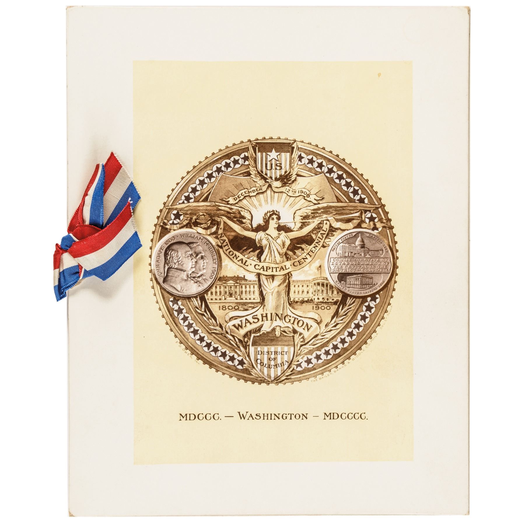 Extravagantly designed Official Program to the festivities planned for the American elite who were invited to the celebrate the 100th Anniversary of our Nation's Capital, with a reception at the White House, plus a Parade, and Reception at Corcoran Gallery, etc. This Invitation Program measures 9.5” x 7.5” and is composed of 6 leaves of heavy card stock, lithographed with color, and some gilt on rectos only with embossing, all tied together with red, white & blue .75” wide patriotic silk ribbon. The outer margin edges gilt. Accompanied by an Engraved Invitation, on a slightly thinner stock. Provenance: L. Bradford Prince, Governor of New Mexico Territory. Small nick and separation tear at the ribbon hole of the first cover card. A very beautiful historic commemorative piece marking the 100th Anniversary of our Nation’s Capital.