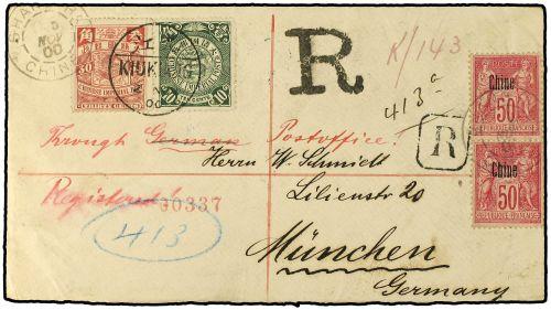 1900 Registered combination cover to Munich franked by China CIP 10 c. green and 30 c. claret tied by Kiukiang cds (Nov 2), forwarded on with France Chine 50 c. carmine rose vertical pair tied by Shanghai cds. Munich arrival (Dec 8) on reverse of scarce cover.