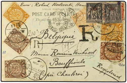 1900 Registered postcard, combination usage to Belgium franked by China CIP ½ c. brown (2), 1 c. orange (2), 2 c. red, 4 c. brown and 5 c. pink cancelled at Hankow; forwarded from Shanghai with France Chine 2x25 c. (Nov 22). Colourful and scarce usage.