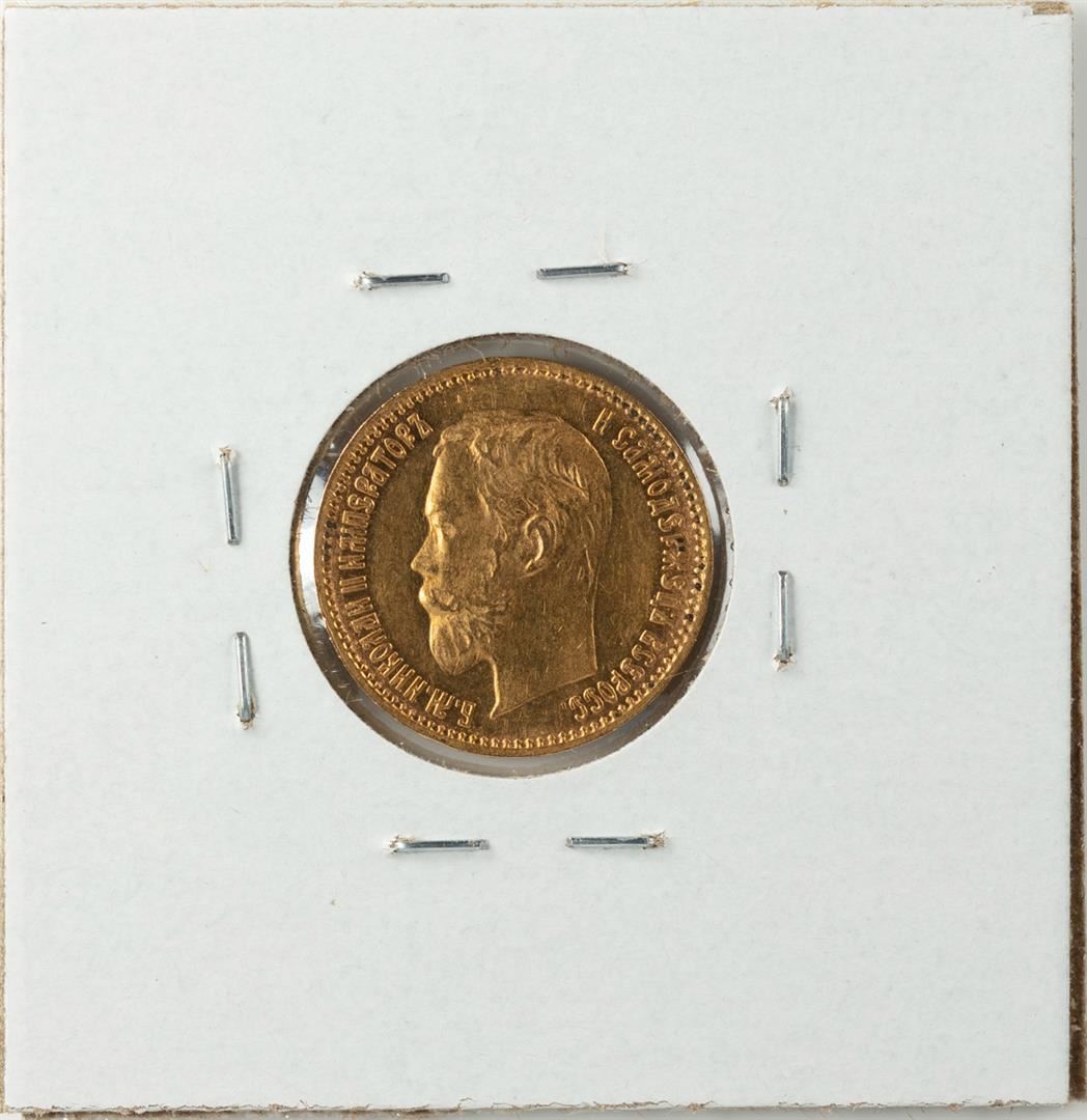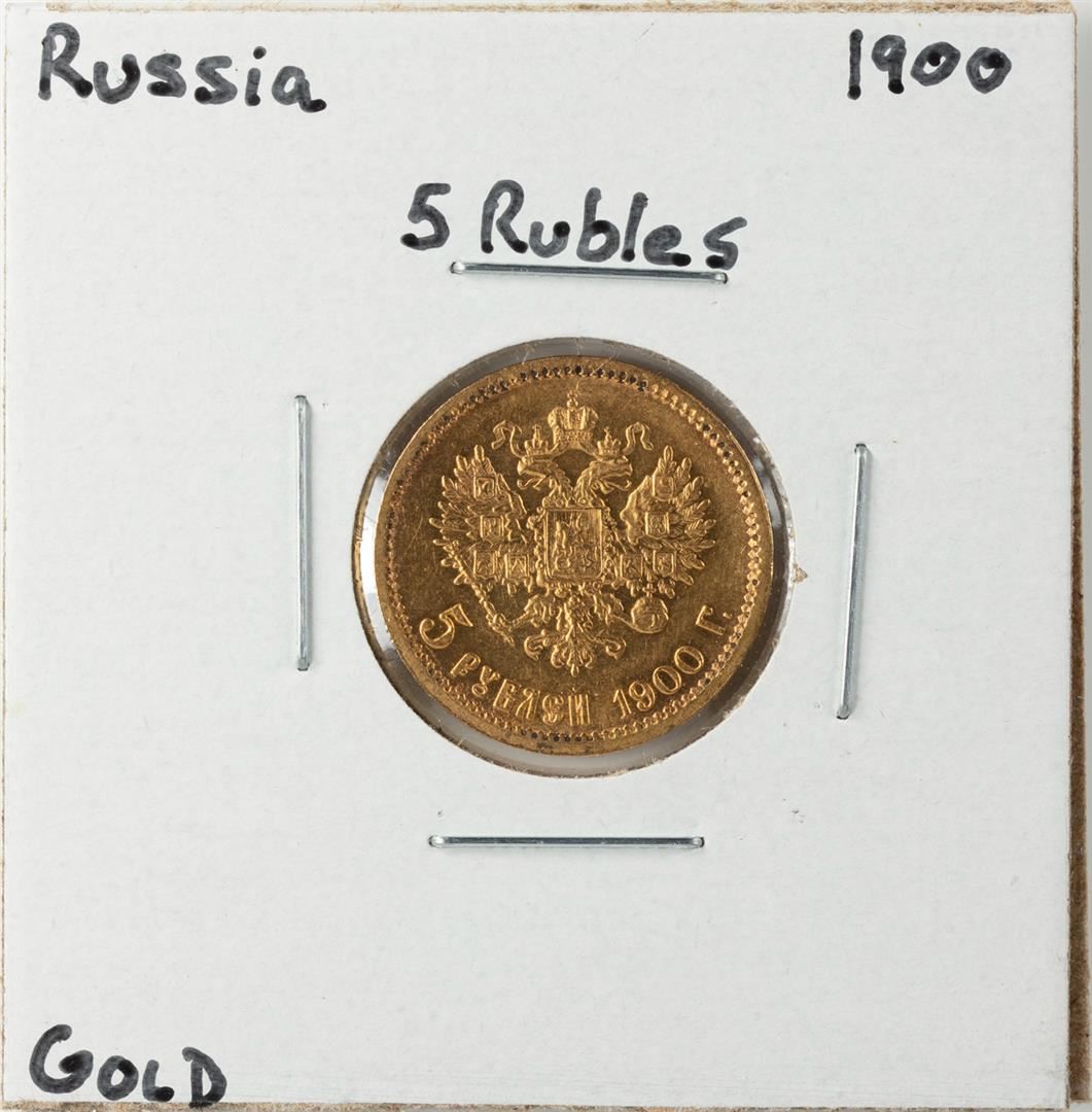 One 1900 Russia 5 Rubles Gold Coin.