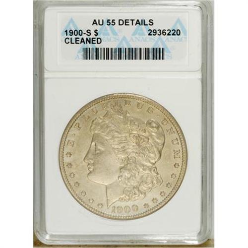<B>1900-S $1 --Cleaned--ANACS. AU55 Details.</B></I> NGC Census: (81/1985). PCGS Population (67/3547). Mintage: 3,540,000. Numismedia Wsl. Price for NGC/PCGS coin in AU55: $68. (#7270)<BR><BR><b>Shipping:</b> Coins & Currency (<a target="_blank" href="http://www.heritageauctions.com/common/shipping.php">view shipping information</a>)