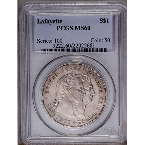 <B>1900<img border='0' src='http://www.heritagecoins.com/images/star.gif' width=10 height=10>$1> Lafayette Dollar MS60 PCGS.</B></I> DuVall 1-B. Gray-tan surfaces reveal somewhat subdued luster, and a scattering of contact and slide marks on Washington's cheek. the design elements re adequately brought up.