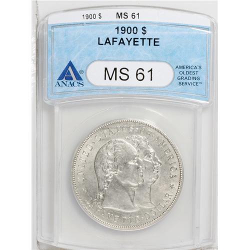 <B>1900 S$1 Lafayette Dollar MS61 ANACS.</B></I> DuVall 1-B. A softly lustrous and typically struck piece, gold-gray with a few small dark spots in the right reverse field. Numerous light abrasions are noted on the busts, doubtless due in part to the poor handling of this issue in production.<BR><I>From The Monedas Oro Collection.</B></I><BR><BR><b>Shipping:</b> Coin/Currency (<a target="_blank" href="http://www.heritageauctions.com/common/shipping.php">view shipping information</a>)