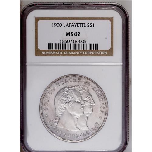 <B>1900<img border='0' src='http://www.heritagecoins.com/images/star.gif' width=10 height=10>$1> Lafayette Dollar MS62 NGC.</B></I> DuVall 1-B. A satiny Lafayette dollar with light chestnut-gray toning and an assertive strike. A few minor grazes seem unimportant for the designated grade.