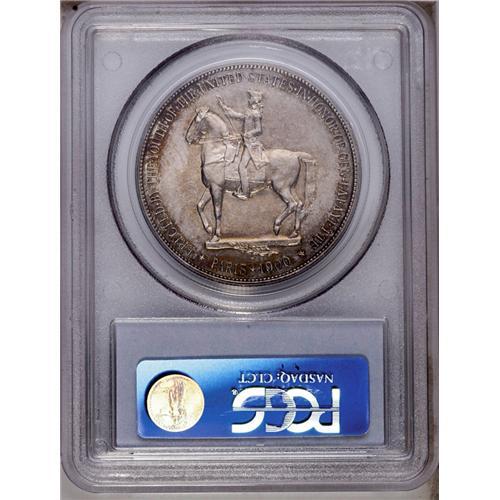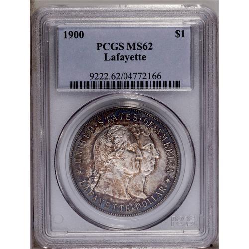 <B>1900<img border='0' src='http://www.heritagecoins.com/images/star.gif' width=10 height=10>$1> Lafayette Dollar MS62 PCGS.</B></I> DuVall 2-C. Brilliant underlying satin luster is complemented by splashes of golden-brown toning, changing to deeper gunmetal-blue along the obverse border. <BR><BR><B>Important notice:</B> Heritage usually auctions material at the rate of 200-250 lots per hour. On some occasions eBay Live bid software or the Internet may not be able to keep up with the pace of the auction. We recommend placing a realistic absentee bid now as insurance to avoid disappointment. Occasionally the auctioneer may eliminate or reject an eBay Live bid, and the auctioneer may also reopen a lot after the close of the eBay live bidding (usually because we missed an audience bid), and may reject your bid even if it shows you as the winning bidder. By bidding via eBay Live, you agree that Heritage may award the lot to another bidder at its sole discretion under the circumstances described above or any other reasonable circumstances. Since eBay bids are not shown to us until we open the lot on the floor, we treat those bids just like floor bids. In most cases the floor responds before the eBay bid is presented to us, due to Internet lag time, so for consistency we have made it a policy that floor bids are always considered first over tie eBay live bids. Also please note that all Heritage lots purchased through eBay Live carry a 20% Buyer's Premium. Please make sure you read the Terms and Conditions before you bid. This lot is being auctioned in conjunction with a live floor auction by Heritage Galleries & Auctioneers. All final auction and invoice information will be supplied by Heritage Galleries & Auctioneers, and all other information should be considered preliminary. Lot:4826 <BR><BR><B>Winning Notification and Billing:</B> After the FINAL session in this auction is complete, Heritage will send e-mail and snail mail invoices. This process normally takes several days. All final auction and invoice information will be supplied by Heritage Galleries & Auctioneers, and all other information should be considered preliminary. <BR><BR>This auction will be conducted on a live auction floor and over the Internet through eBay Live. If you choose to place an absentee bid, please take a moment to <font color='#0000ff'><u><a href='http://pages.ebay.com/liveauctions/help/before/laabsentee.html'>learn how eBay Live absentee bidding works</a></u></font><font color='#000000'>