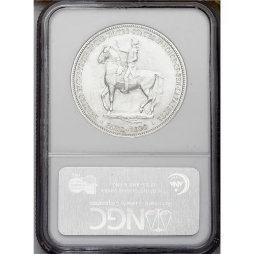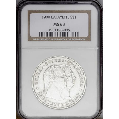 <B>1900<img border='0' src='http://www.heritagecoins.com/images/star.gif' width=10 height=10>$1> Lafayette Dollar MS63 NGC.</B></I> DuVall 2-C. The obverse is identified by a doubled final S in STATES, and a pellet that is centered between OF and AMERICA. On the reverse, the branch has a short and heavy stem. Bright silver-gray surfaces exude soft luster and nicely defined motifs. Minute contact marks are noted on Washington's cheek and neck.
