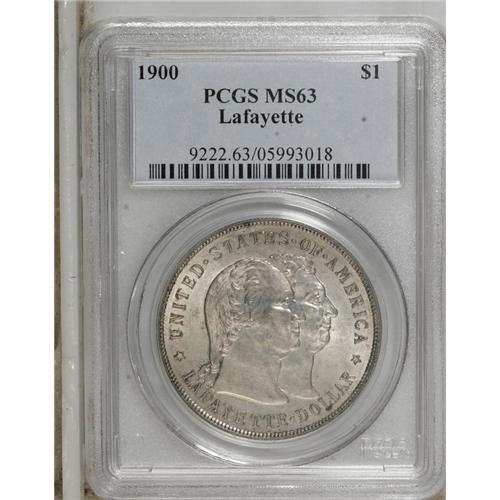 <B>1900 S$1 Lafayette Dollar MS63 PCGS.</B></I> DuVall 1-B. This satiny and sharply impressed silver dollar has even and original light olive-gray toning. Marks are inconsequential for the grade, and the eye appeal is irrefutable.<BR><BR><b>Shipping:</b> Coins & Currency (<a target="_blank" href="http://www.heritageauctions.com/common/shipping.php">view shipping information</a>)
